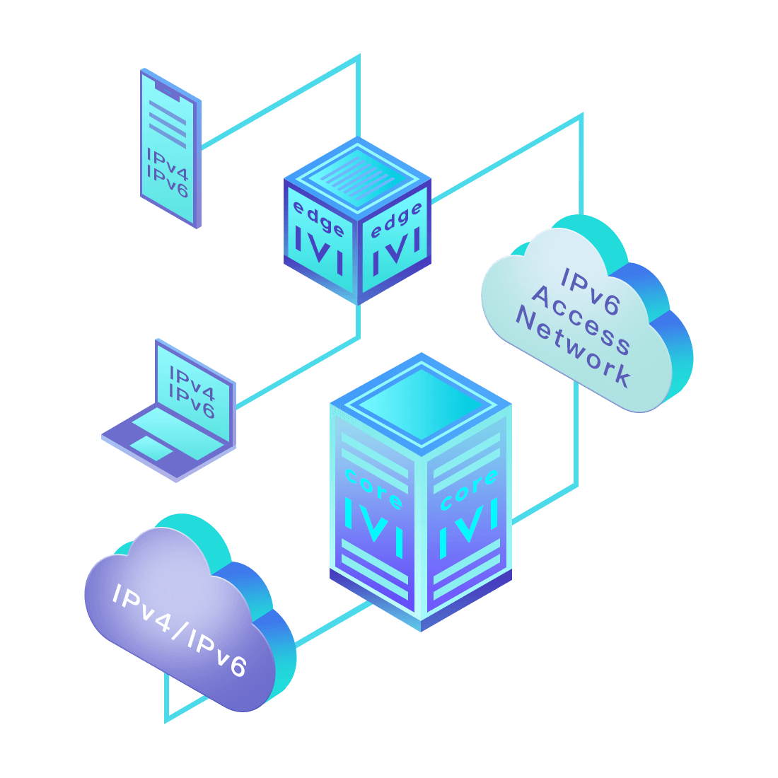 對(duì)正在進(jìn)行IPv6整體升級(jí)規(guī)劃的運(yùn)營商,應(yīng)用IPv6升級(jí)方案2.5,通過IVI無狀態(tài)翻譯技術(shù)和純IPv6接入網(wǎng)絡(luò),為雙棧客戶端和雙棧服務(wù)器提供連通服務(wù)。